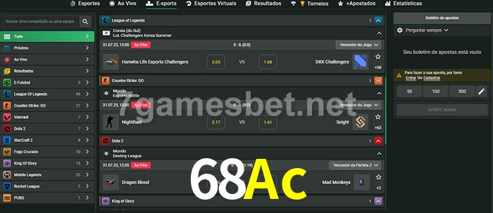 A aposta 68Ac oferece aos jogadores a experiência mais conveniente de apostas em eSports!